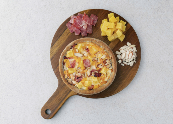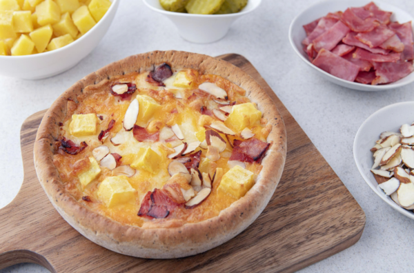 Phô mai (Mozzarella, Gouda), bột mì (Mỹ, Canada), khoai lang chế biến (~21%), sốt cà chua, thịt xông khói, phô mai tổng hợp, gạo đen, hạnh nhân lát, dầu đậu nành, men, đường, muối, bột whey, chất cải thiện bột & enzyme.